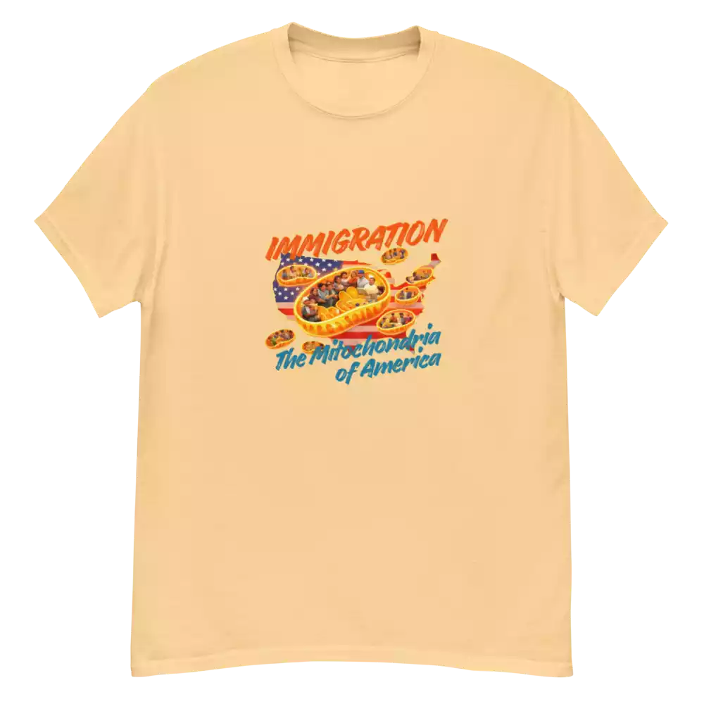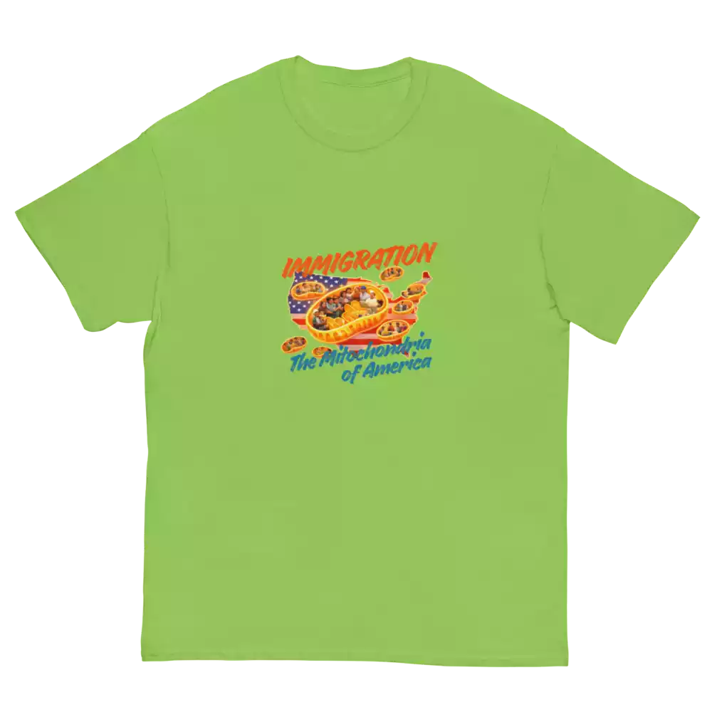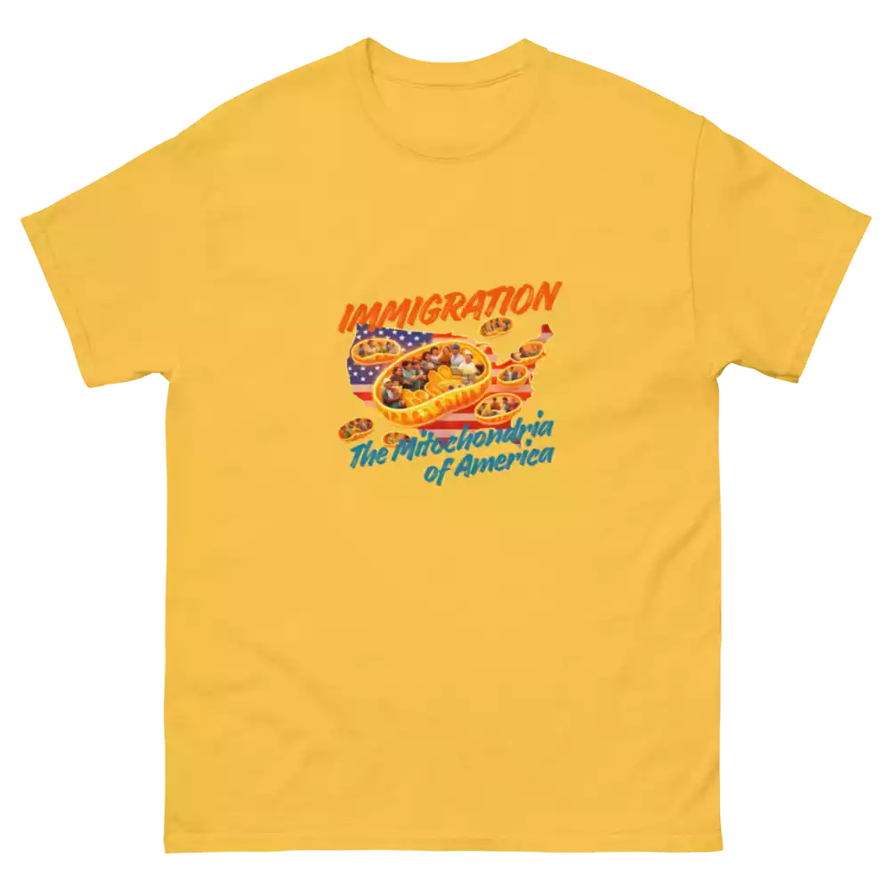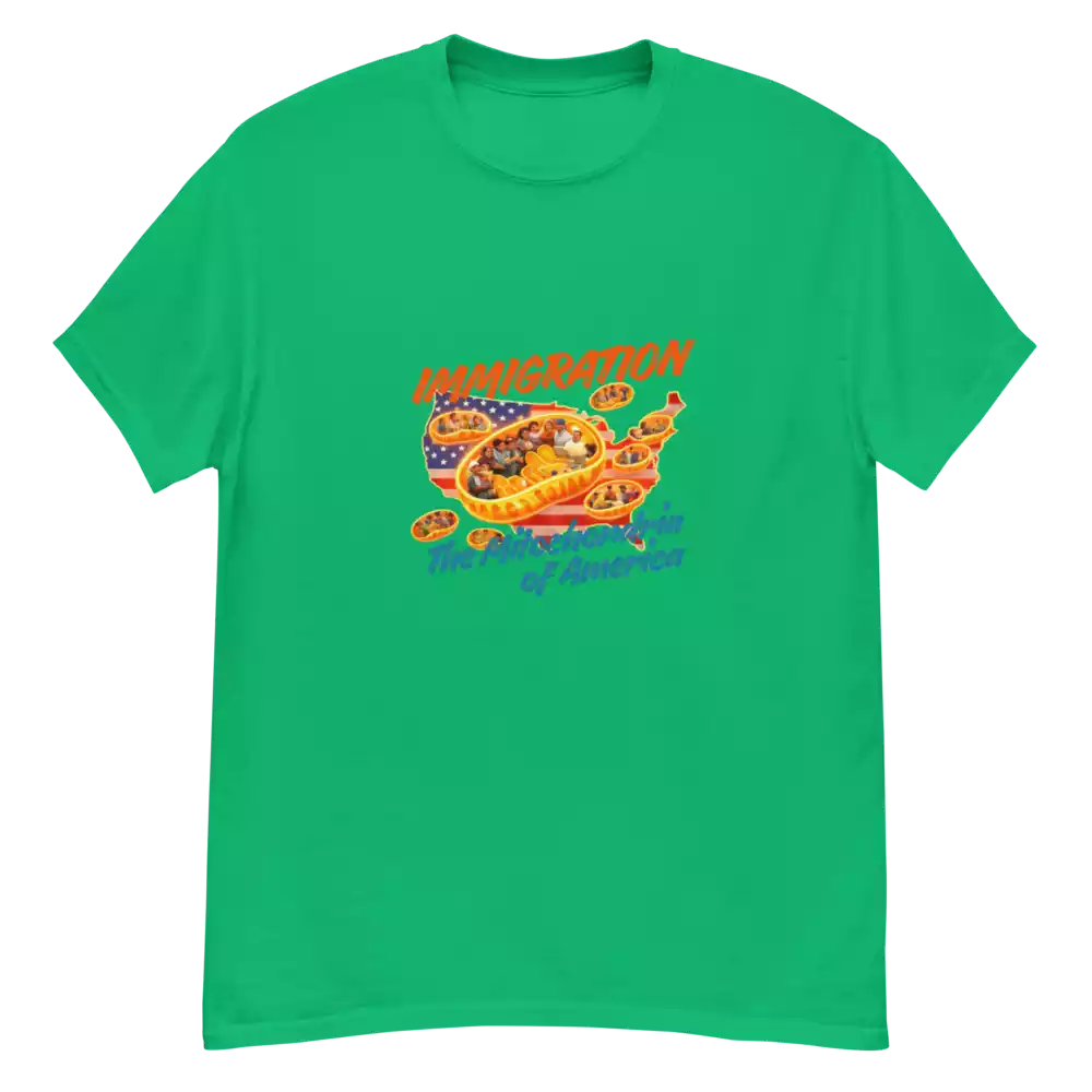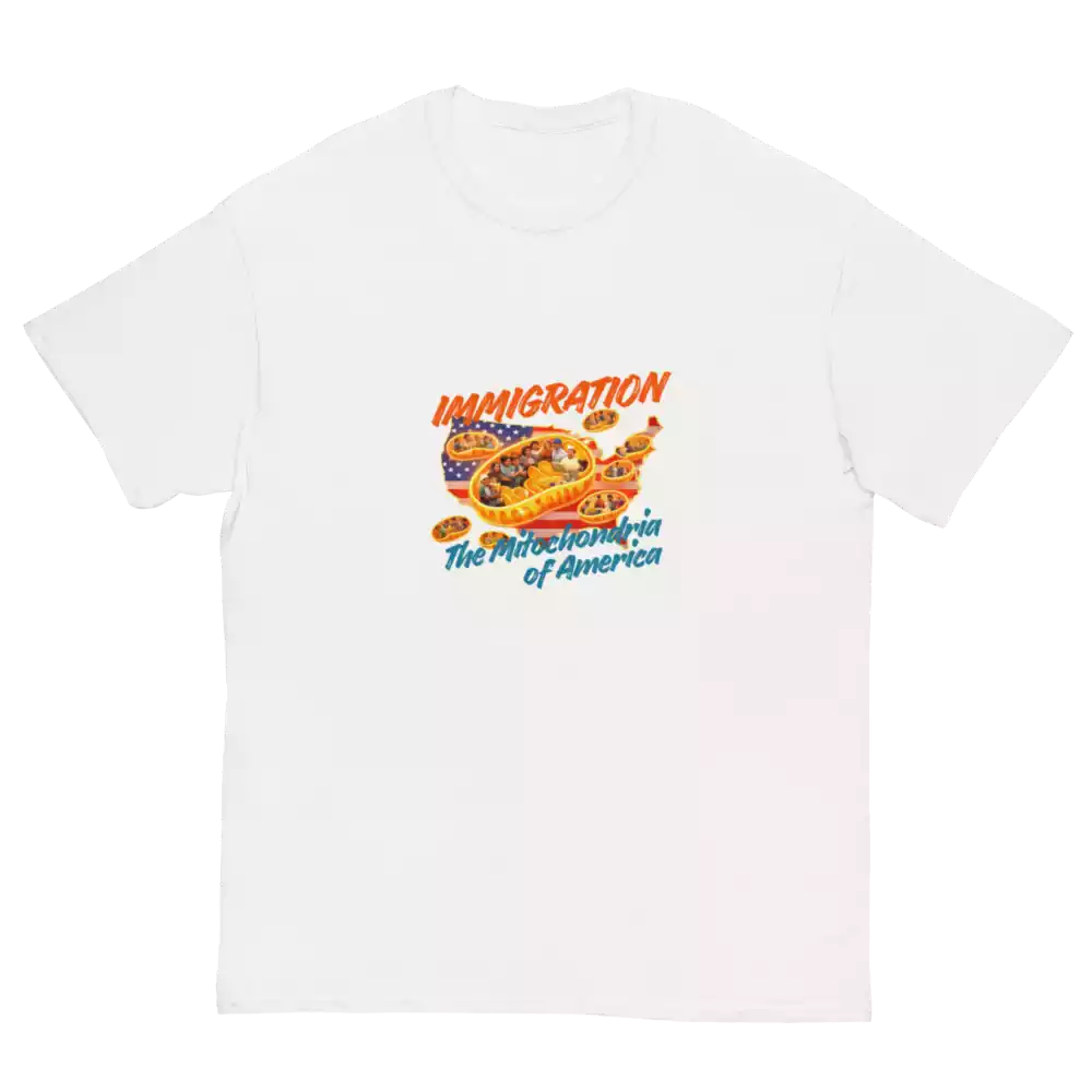 This shirt takes a familiar science metaphor and applies it where it belongs. Just as mitochondria power every living cell, immigrants have long powered the growth, resilience, and everyday functioning of the United States. The design makes that idea visible: energy, contribution, and movement at the core of the country itself.