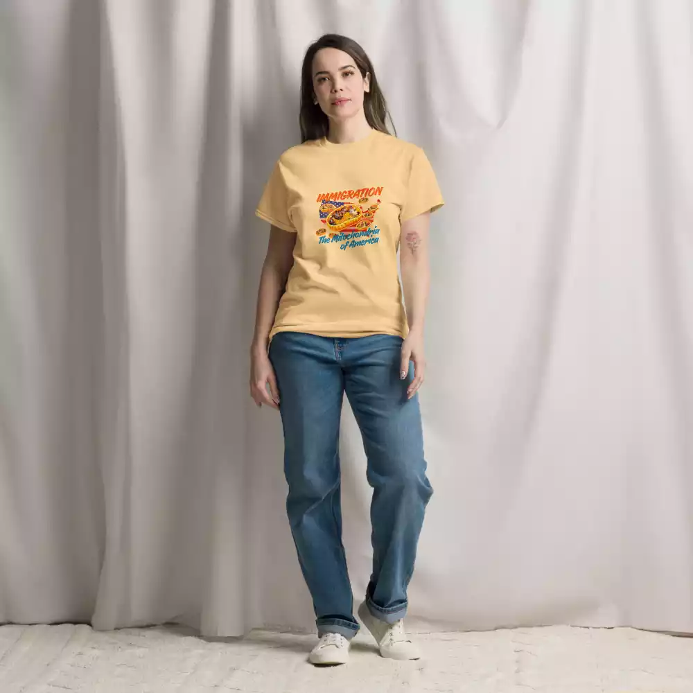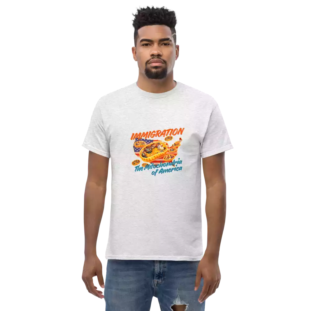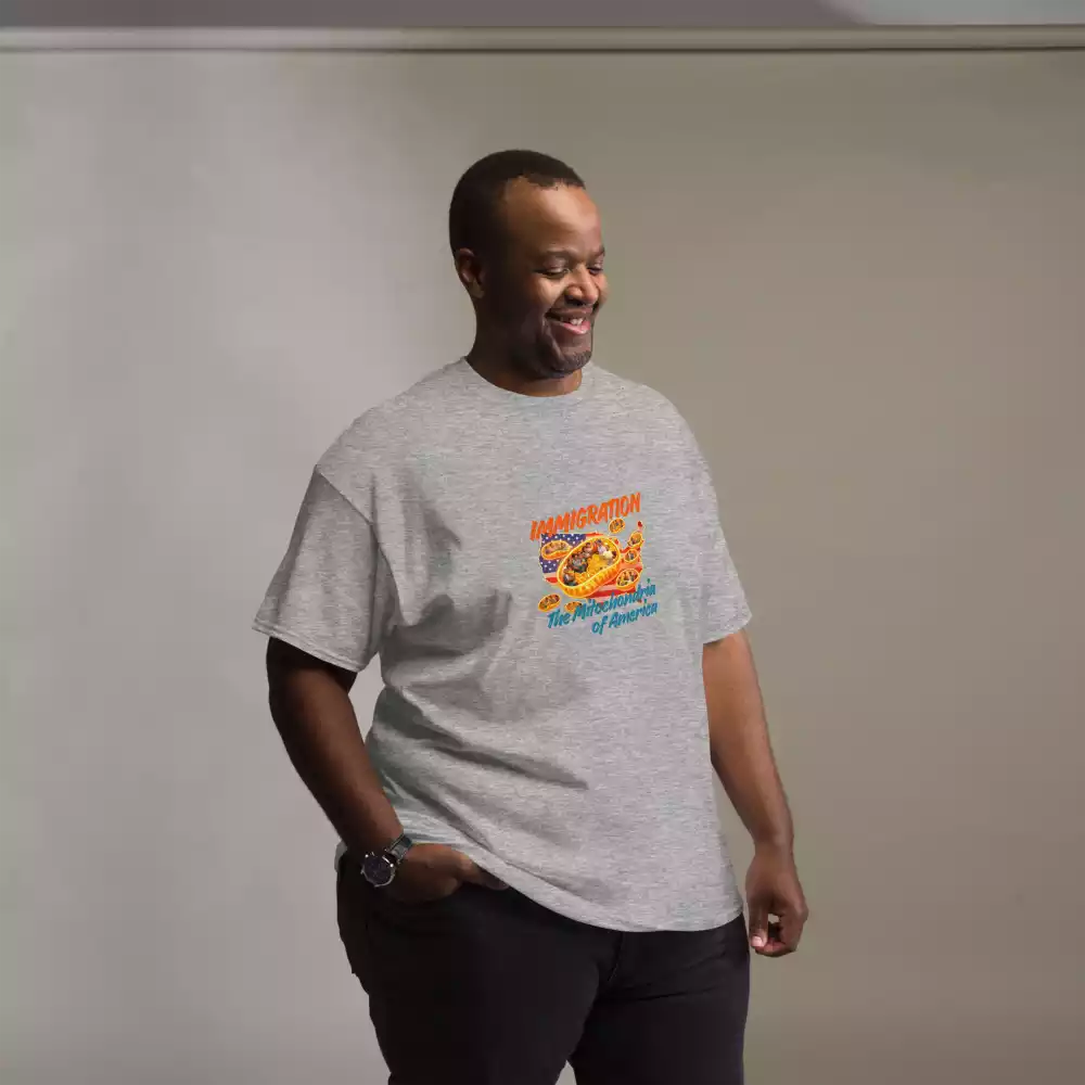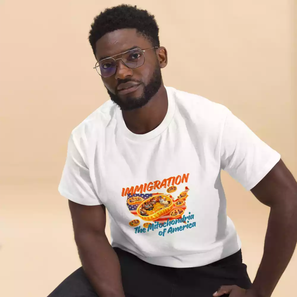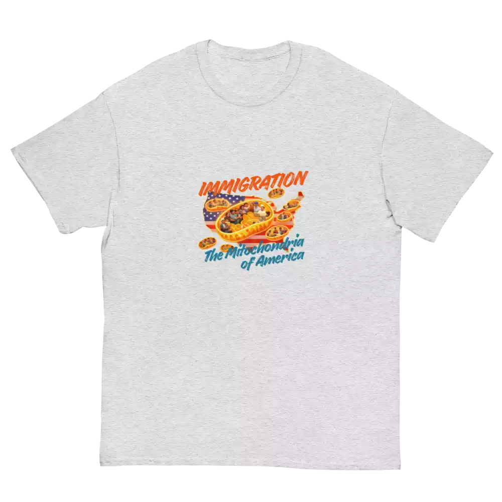 This shirt takes a familiar science metaphor and applies it where it belongs. Just as mitochondria power every living cell, immigrants have long powered the growth, resilience, and everyday functioning of the United States. The design makes that idea visible: energy, contribution, and movement at the core of the country itself.