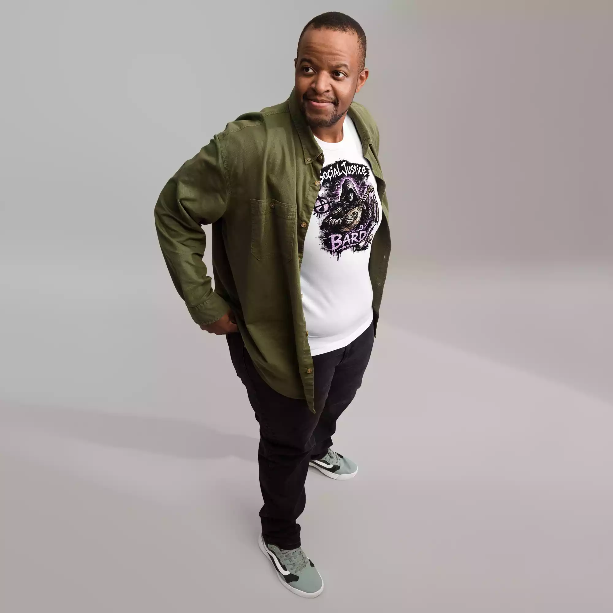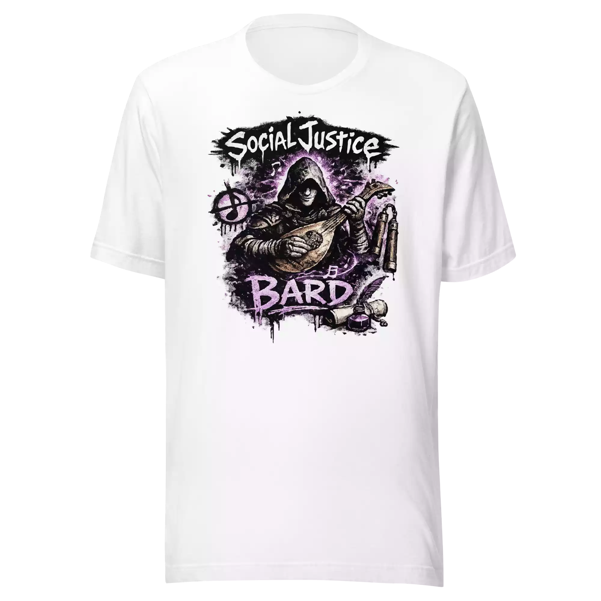 The Social Justice Bard tee celebrates the voices that lead the chants and tell the stories long after the crowd has gone. Soft, lightweight, and comfortable, it’s made for everyday wear with a sharp, satirical edge rooted in performance, memory, and movement.