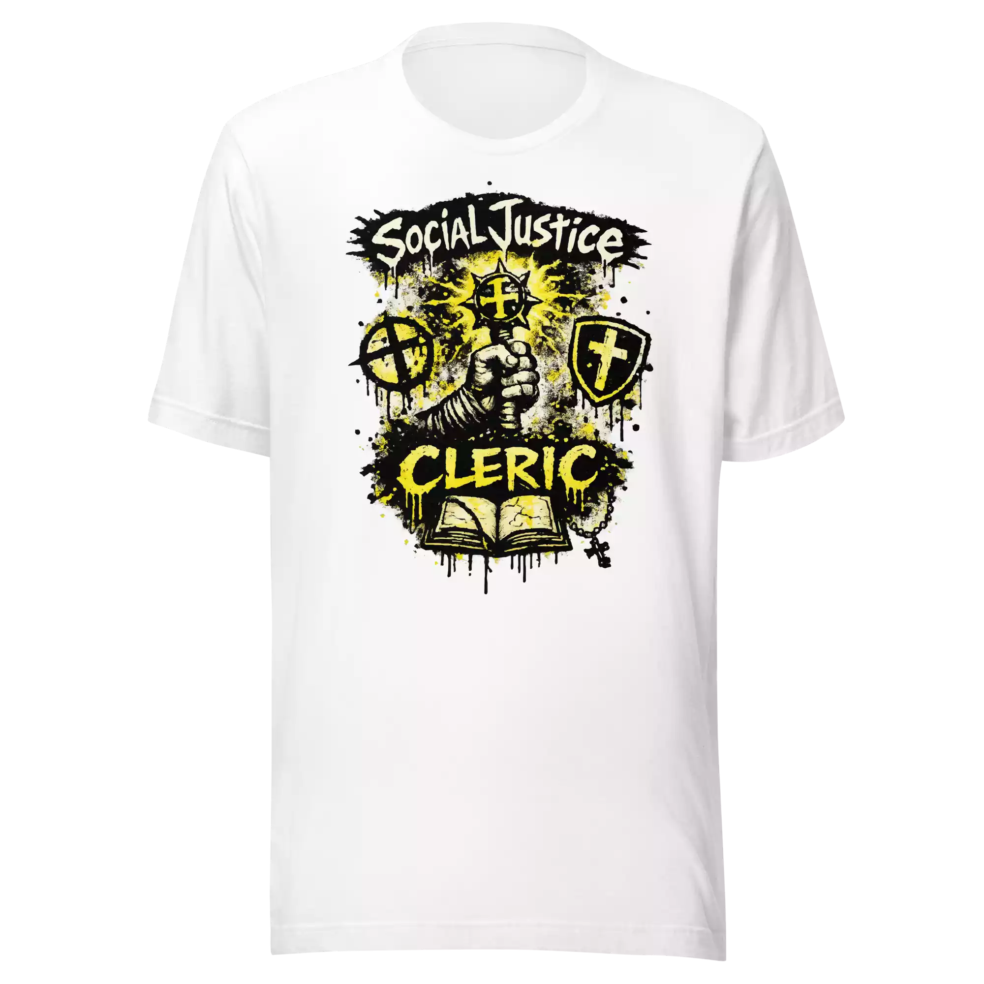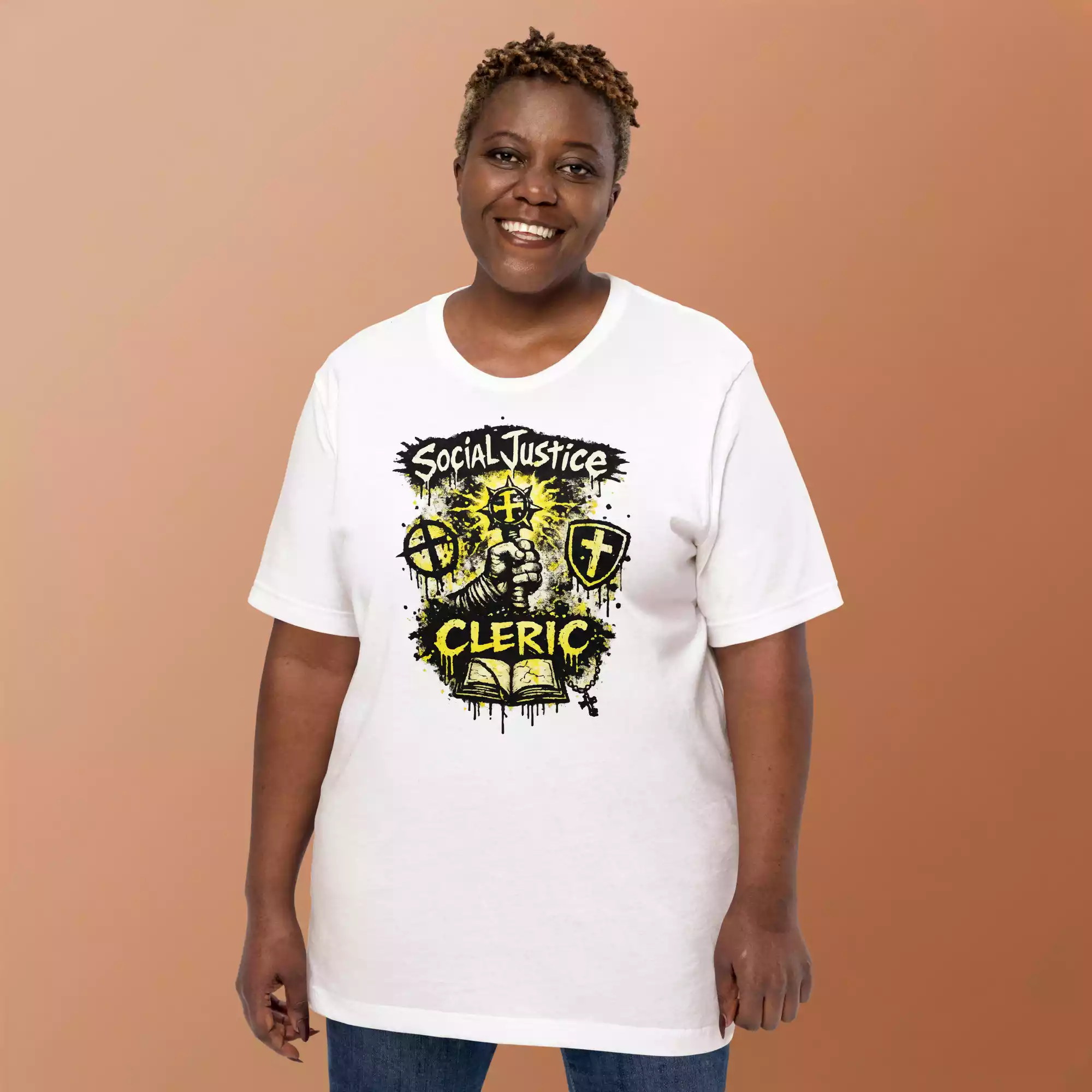 The Social Justice Cleric tee honors the emotional support of every cause. Soft, lightweight, and comfortable, it’s made for those who guide, heal, and keep the movement grounded without losing its moral compass.